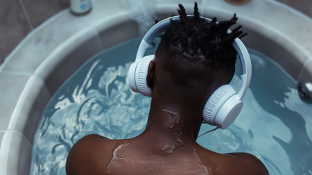A calm Black woman, immersed in music with headphones, seated in a hot tub and engaged in a video call from the outdoor bath.