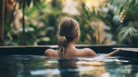 A person enjoys a tranquil soak in a spa while surrounded by vibrant tropical plants and serene water.