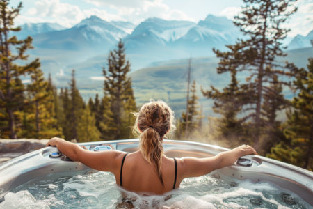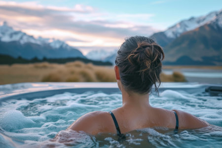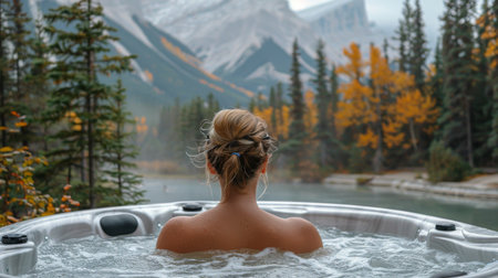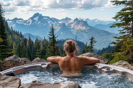 A serene woman enjoys a moment of relaxation in a hot tub, surrounded by breathtaking mountains and lush greenery, capturing the essence of tranquility and natural beauty.
