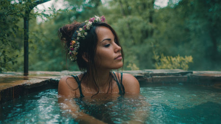 A woman enjoys a peaceful moment in a hot spring surrounded by dense trees and soft light. She wears a flower crown and appears lost in thought embracing tranquility.
