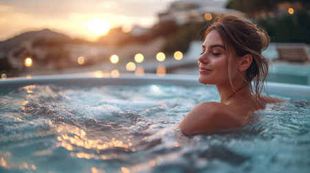 Portrait of a young beautiful woman relaxing in a hot tub.