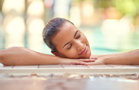 Home is where the pool is. a young woman relaxing in the pool at a spa.