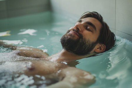 Bearded man soaks in a tranquil warm bath infused with healing Epsom salts, eyes closed in deep relaxation