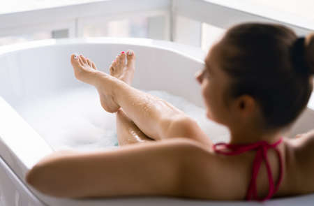 Woman in bubble bath after pedicure and toe nail polish. Lady relaxing in bathtub. Clean wet legs and feet in tub with foam. Pamper and therapy treatment in spa. Girl enjoying hot water in the morning