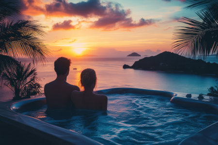 A couple relaxes in a hot tub, admiring a vibrant sunset over the ocean and distant islands.