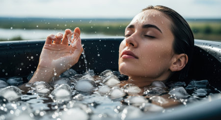 Woman immersed in an ice bath outdoors, holding an ice cube with water dripping. Her eyes are closed, indicating relaxation during cold therapy for wellness and recovery.
