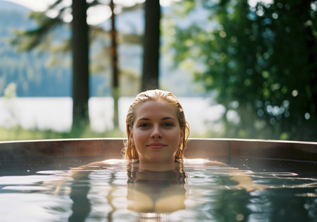 A smiling blonde woman with wet hair soaks in a steaming wooden hot tub, enjoying a tranquil spa day and wellness retreat in a beautiful outdoor nature setting by a lake.