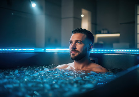 A determined young man immersed up to his shoulders in a cold plunge tub filled with ice, utilizing cryotherapy for muscle recovery and wellness in a dark, modern spa setting.