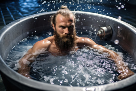 A rugged man with a beard and topknot is immersed in an ice bath during a cryotherapy session. The focused expression and icy water droplets emphasize the intensity and therapeutic nature of the treatment