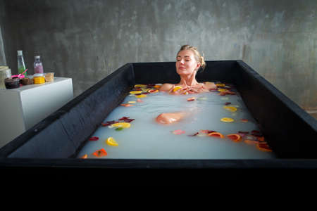 attractive slim blonde girl taking bath with milk, hot water, colorful rose petals, and citrus slices in deep black bathtub