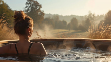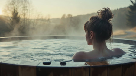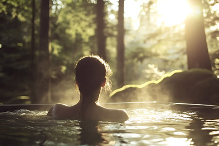 Woman enjoys a peaceful moment of relaxation in a steaming hot tub, immersed in the tranquility of a sunlit forest at sunrise, embracing the serenity of nature