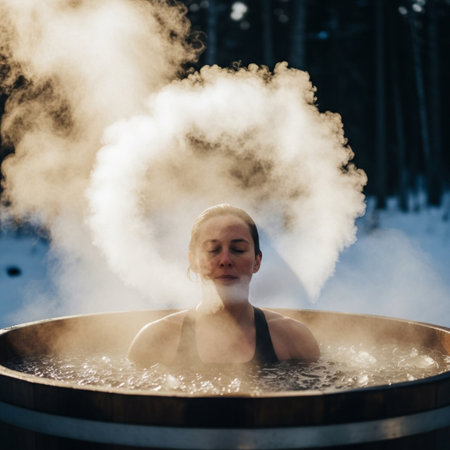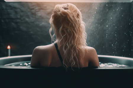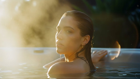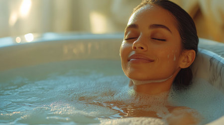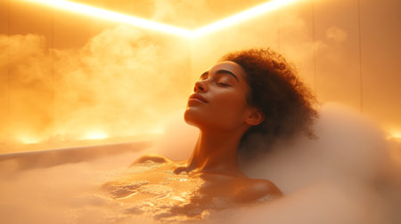 A young woman enjoys a peaceful moment in a warm bath, surrounded by soft steam that creates a tranquil and calming atmosphere, perfect for relaxation.