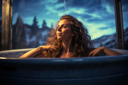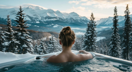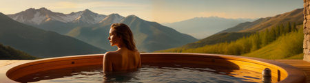 A serene woman enjoys a moment of relaxation in a hot tub, surrounded by breathtaking mountains and lush greenery, capturing the essence of tranquility and natural beauty.