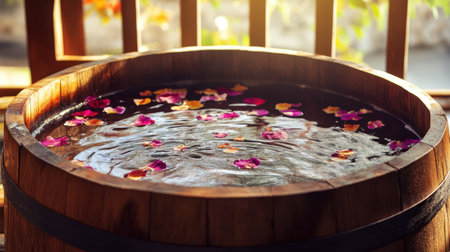 A peaceful wooden bathtub filled with water and colorful petals offers a serene spa experience. Ideal for relaxation and self-care in a natural setting.