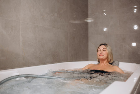 Relaxed lady in her forties relaxing in a modern soaking tub