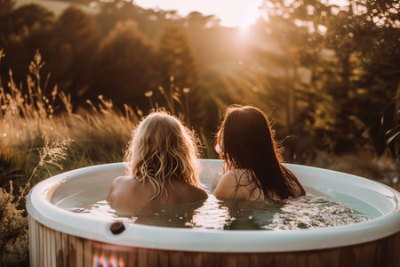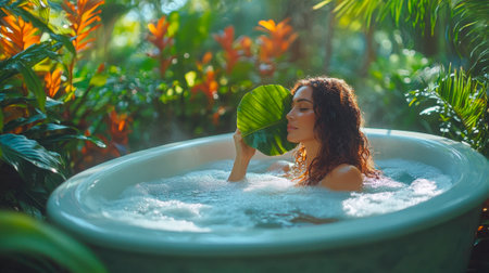 Romantic women enjoying a hot bath in an outdoor setting, natural light, calming mood. Generative AI