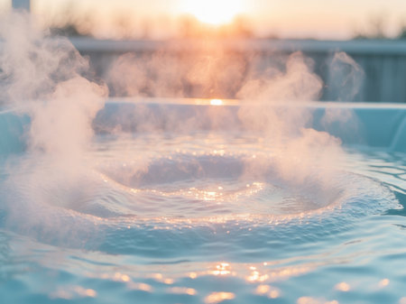 Close-up of water jets bubbling in a hot tub with steam rising in the evening light