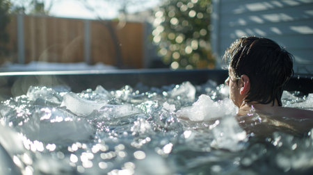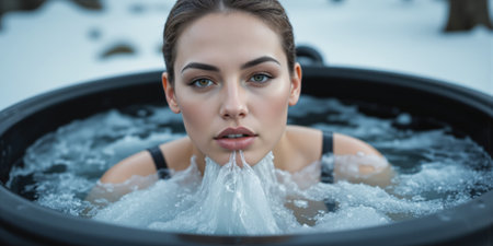 Outdoor Ice Bath for Recovery A close-up of someone submerged in an ice bath, breath visible in the cold air, focused
