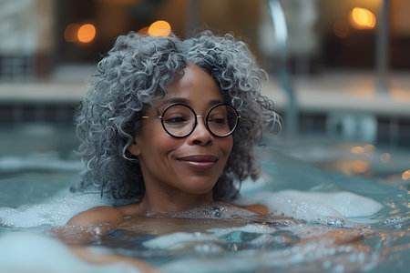 Woman with curly gray hair and glasses enjoying a serene bath in an indoor pool. the warm, ambient lighting and gentle bubbles create a peaceful atmosphere, perfect for relaxation and unwinding. Generative AI
