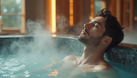 A serene young man with dark hair relaxes in a steamy hot tub, eyes closed in blissful tranquility. The soft steam envelops him, creating an atmosphere of calm and rejuvenation, perfect for unwinding.