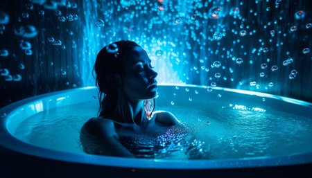 A woman enjoys a serene moment in a spa, surrounded by soothing lights and warm water, creating a calming atmosphere for relaxation and rejuvenation.
