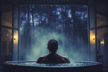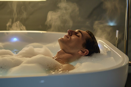 A man relaxes in a hot bath filled with bubbles and steam. The warm water and soft lighting create a serene and tranquil atmosphere.