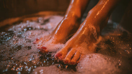 A close-up view of a woman's feet submerged in bubbles, creating a serene atmosphere ideal for promoting relaxation, beauty, and self-care practices.