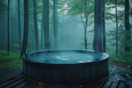 A tranquil hot tub sits in a misty forest, surrounded by tall trees.