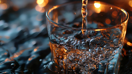 Water is poured from a bottle into a glass, creating bubbles and a ripping effect.