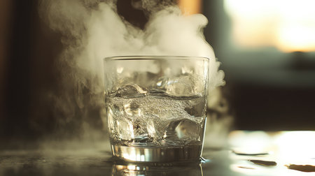 A glass of water with ice cubes and mist, captured with dramatic lighting. Ideal for themes of refreshment, hydration, and coolness.