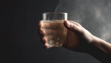 A close-up view of a hand holding a glass of ice-cold water, which is covered in beads of condensation. The image effectively conveys the feeling of refreshment, coolness, and quenching thirst, with subtle steam rising from the top.