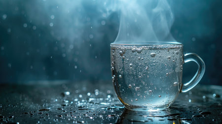 A close-up of a transparent glass cup with steaming water being poured, creating a tranquil atmosphere with a dark and moody background.