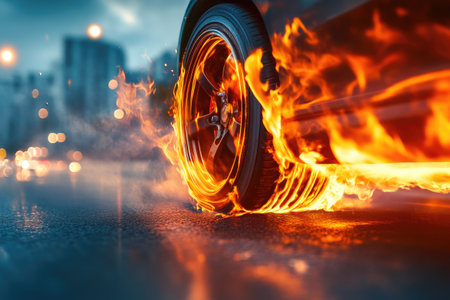 Flames Erupting from a Wheel on a Moving Car in Urban Landscape