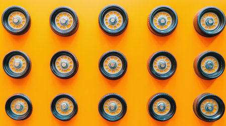 A vibrant display of vintage toy wheels arranged against a bright orange background, perfect for artistic inspirations, playful designs, and creative projects.