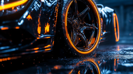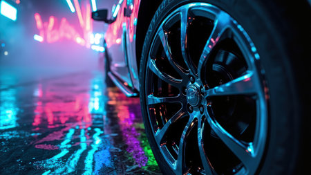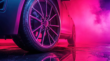 This striking image features a close-up view of a car wheel illuminated by vibrant neon lighting, reflecting on a wet urban surface, creating a dynamic atmosphere.