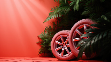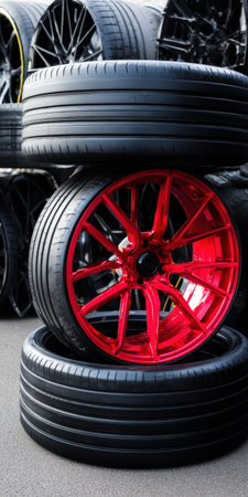 Black rubber tires with one prominently stacked red custom alloy wheel rim, showcasing automotive tuning, performance, and vehicle customization industry concepts