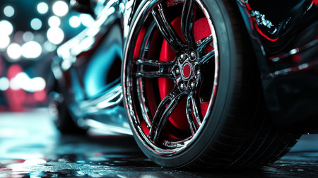 A close-up of a car wheel with a glossy chrome finish reflecting neon lights on a wet street.