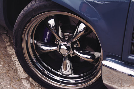 Chromed rim and brembo disc brake at car show - Talagante, Chile - Oct 01, 2023