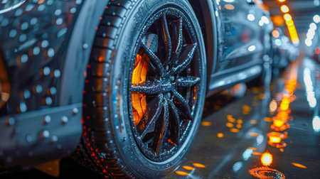 Close up of black car wheel with reflection in the water. Car wash concept.
