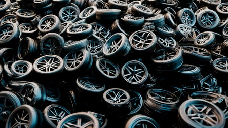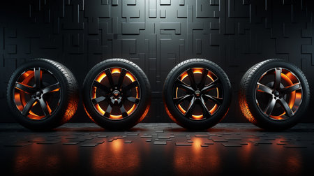 This image presents a set of car wheels and tires arranged on a dark surface. The composition emphasizes the textures and patterns, with a focus on the metallic rims and the rubber tires. The lighting suggests a studio environment, suitable for automotive, design, or product promotion.