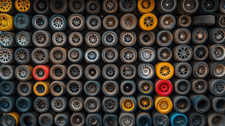 A captivating array of tires showcasing a blend of colors, textures, and patterns. This image serves as an inspiring backdrop for automotive and artistic projects.