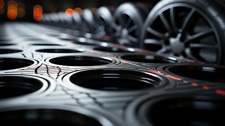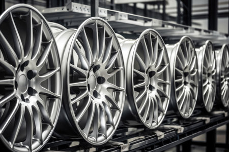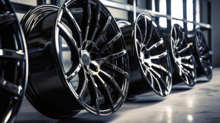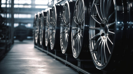 High-quality chrome wheel display showcasing precision engineering in a modern automotive factory setting. Generative AI