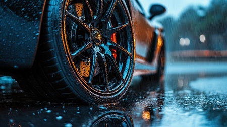 A close-up view of a sports car wheel on a wet road, with water droplets glistening on the rim and tire.