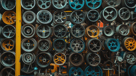 A vibrant collection of car wheels and rims arranged on a wall showcases a variety of designs and colors, perfect for automotive enthusiasts or industry professionals.