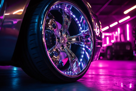 This image showcases a sleek car wheel featuring a shiny metallic finish with vibrant neon lights. The dynamic colors and reflections create an eye-catching visual effect, perfect for automotive themes.