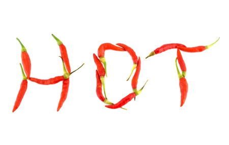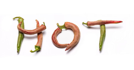 The word hot is written from letters of red pepper on a white