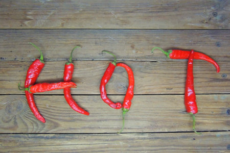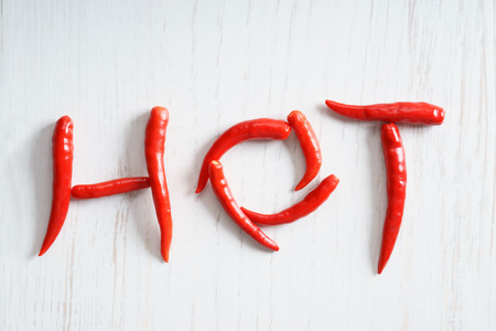 red chilli peppers arranged in a hot word shape on white wooden background