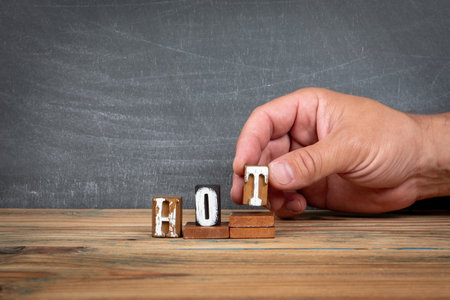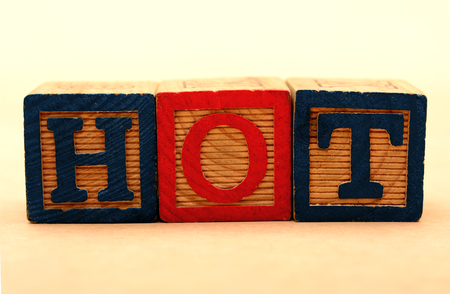 word hot made of brown wooden letters on a blue background