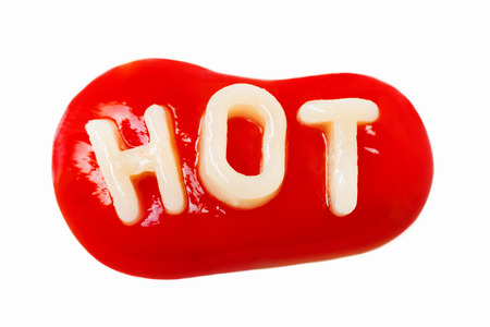 dangerously spicy chili sauce: the word hot written on a white plate with chili sauce, the flames of the letters come up, overhead view, plain background fabric