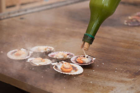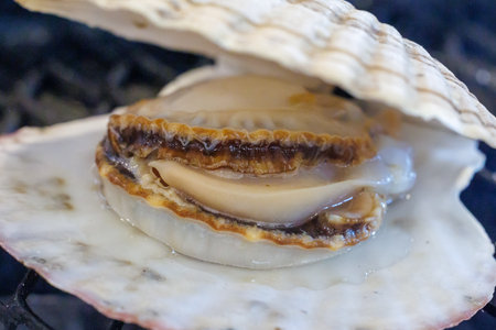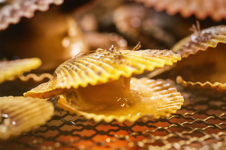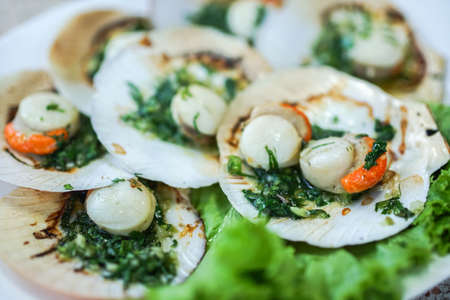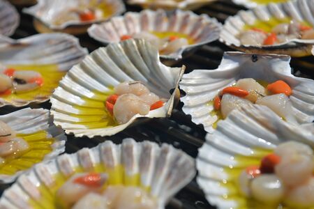 Close up of fresh scallop shell on the grill in the restaurant